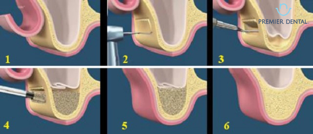 Thực hiện bằng cách mở mô nướu, tạo cửa sổ bên trong mô nướu rồi thực hiện ghép xương vào bên trong. Cửa sổ có thể được khoét theo hình tròn hoặc hình chữ nhật. Khi vị trí mở đã được bổ sung đủ thể tích xương, bác sĩ sẽ đóng của sổ lại. Đợi đến khi xương tương thích hoàn toàn bạn sẽ tiếp tục ca cấy ghép Implant.